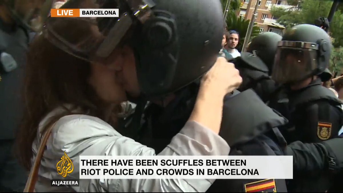 El beso robado de una manifestante a un Policía en Barcelona. Adiós a las armas. Otra forma de acoso. Imágenes de Al Jazeera.pic.twitter.com/rRka1ZZrHB