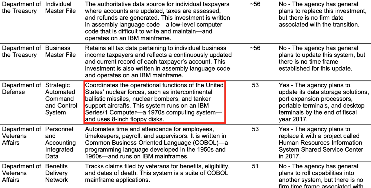 A system for coordinating U.S. nuclear weapons moved off of 8-inch floppies earlier this year, 2 years late. Coincidentally, the original deadline was around when Google Cloud's product roadmap PM said that 1 year deprecation should be enough for anyone. https://www.gao.gov/assets/680/677454.pdf …pic.twitter.com/owJ40GuJzT