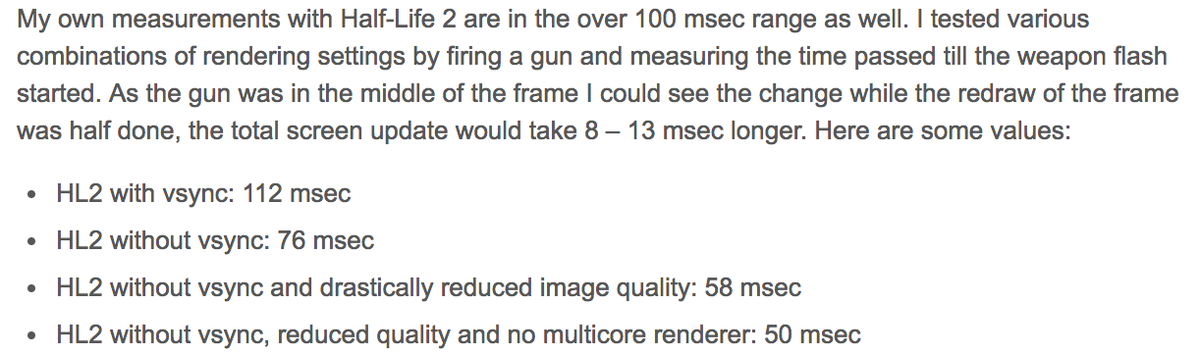 Measured latency from mouse click to on-screen event, using a high-speed camera http://renderingpipeline.com/2013/09/measuring-input-latency/ …pic.twitter.com/ft4hOhBjri