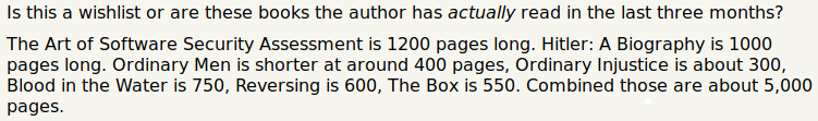 Why is the top comment on "I read" posts always that it's implausible that someone could read that much? 5k pages in 3 mo. isn't that weirdpic.twitter.com/vPaBhc7oVz