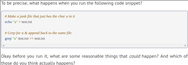 What happens when you grep the file you've redirected grep to? https://anniecherkaev.com/grep-your-way-to-freedom …pic.twitter.com/hb5h7tajRt
