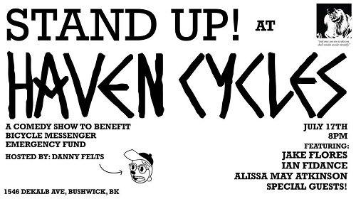 Stand Up comedy show tonight at Haven Cycles will raise funds to support the bicycle messenger emergency fund. Hosted by