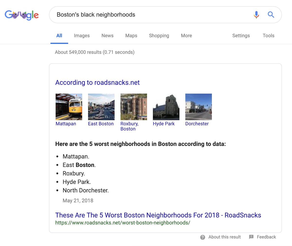 So I do a @Google search for "Boston's black neighborhoods" and the 1st result that pops up is a list of Boston's "worst" neighborhoods. How does that happen?pic.twitter.com/RUaFgMcwNR