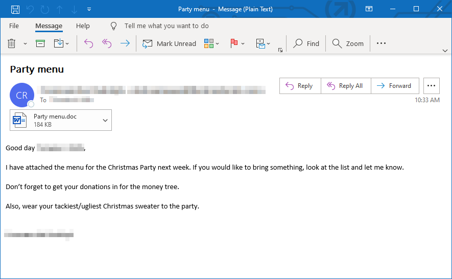 Emotet’s annual season’s greetings are here: the gang has launched its campaign for holidays with email subjects and malicious attachment file names like “Party menu”, “Christmas party”, “Holiday schedule 2019-2020”.pic.twitter.com/tCgoENbYw5