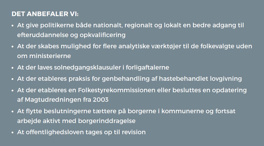 #dkdemokrati. Her er kommissionens forslag under temaet "folkestyret og lov- og beslutningsarbejdet". Hele betænkningen kan hentes her: https://duf.dk/fileadmin/user_upload/Editor/documents/Maerkesager/Demokratikommissionen/Demokratikommissionens_betaenkning.pdf …#dkpolpic.twitter.com/ycZyssmimb