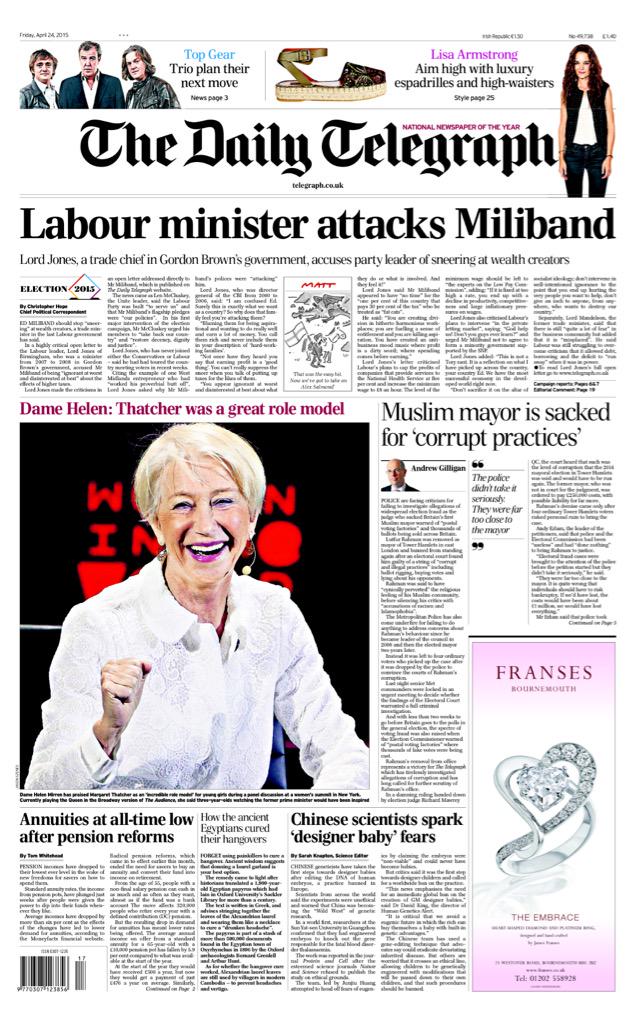 Friday's Telegraph: "Labour minister attacks Miliband" pic.twitter.com/HiLaFRLaj1