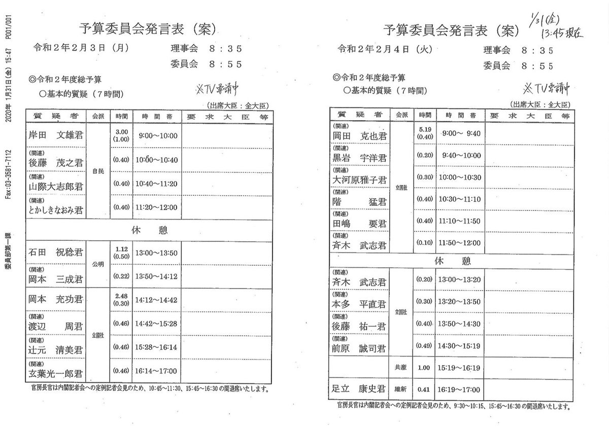 尚、足立さんはコロナ・日中関係・自衛隊中東派遣等の議論を質問要旨で予告中。 火曜の建設的な議論は足立さんだけかもしれない…