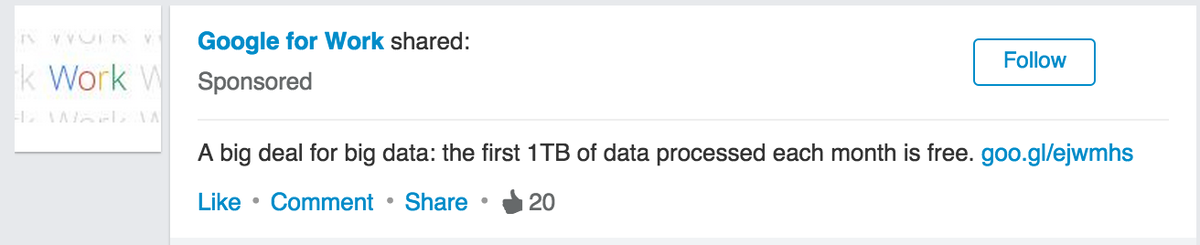Dear Google at Work. 1TB per month, even if free for processing, does *not* a big data make. It's not 1965. #failpic.twitter.com/4I0WdkKUvE