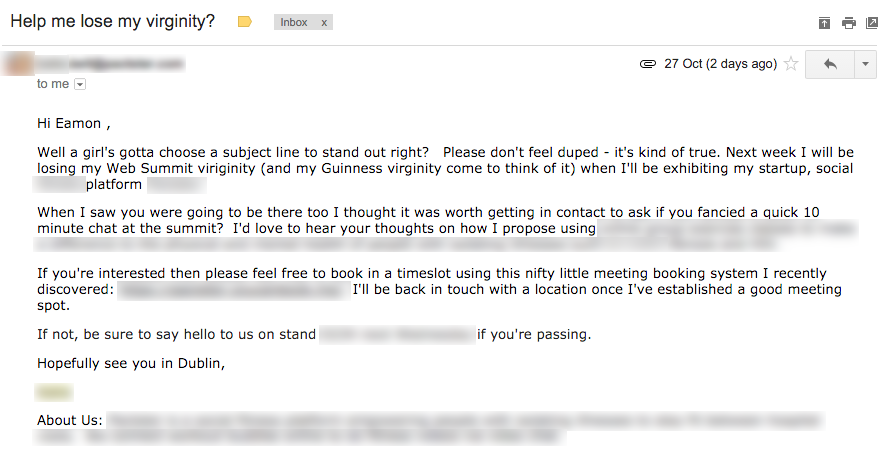 Note to all founders attending #WebSummit - sexual innuendo is an inappropriate way to get investor attention.pic.twitter.com/k6knpIvsA1