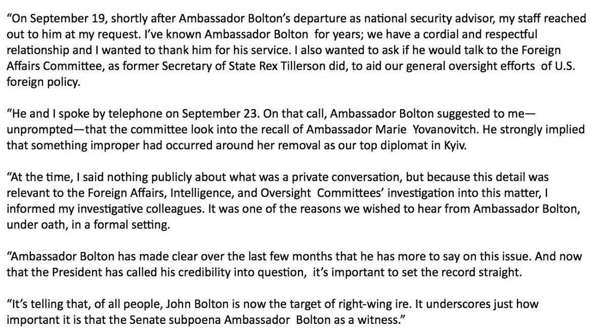 NEW: House Foreign Affairs Chairman Engel releases statement on a September call with John Bolton, says Bolton "suggested to me —unprompted — that the committee look into" Yovanovitch's recall. "He strongly implied that something improper had occurred around her removal"pic.twitter.com/wQDjnmLyMK