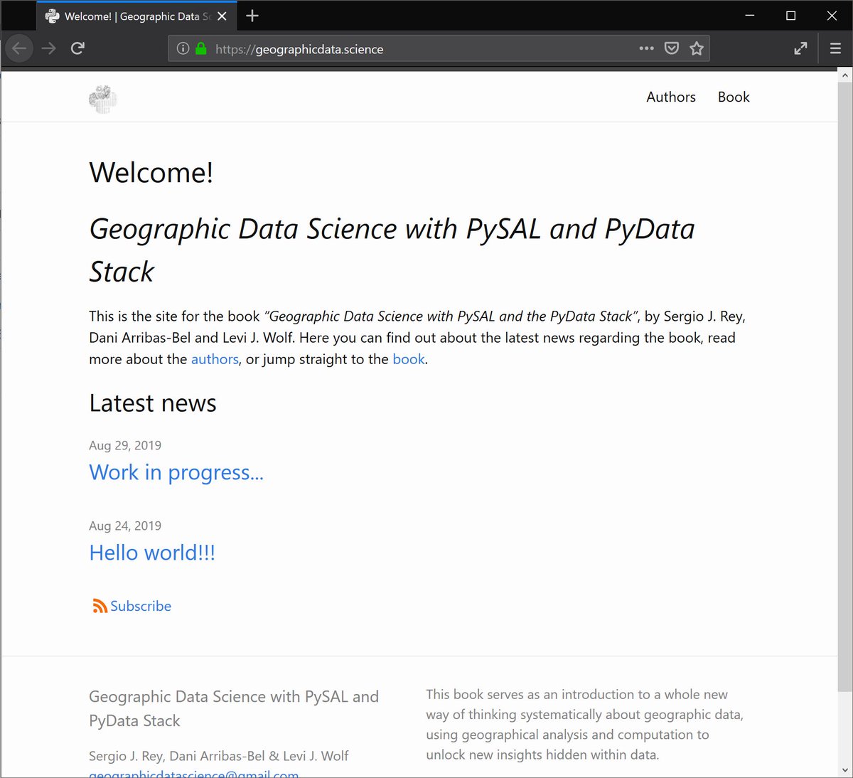 @sergerey,@levijohnwolf and myself are unveiling our new project, "Geographic Data Science with PySAL and PyData Stack", a forthcoming book that we'll develop in the open and you can access freely online. More here: https://geographicdata.science/2019/08/29/project-launch.html …pic.twitter.com/27hkpBvmXf