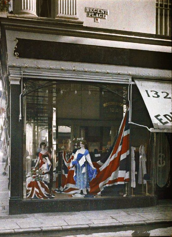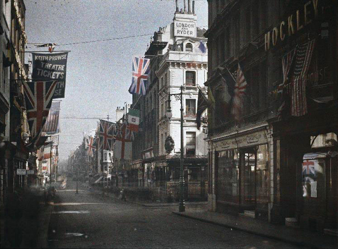 I've brought together some of the most gorgeous colour photographs of London celebrating the end of the Great War; all taken in July 1919 by Fernand Cuville. They're not colourised, they're original colour autochromes of Buckingham Palace, New Bond St, Regent St & Regent Place