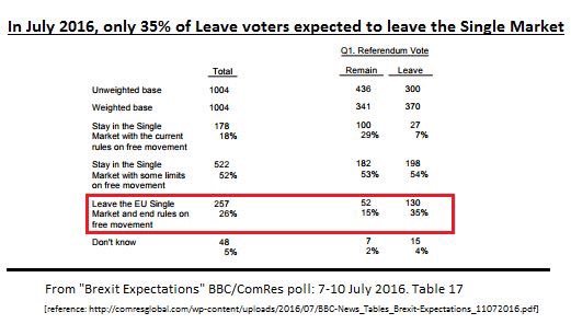 This inconvenient fact is great too: Only 35% of Leave voters expected to leave the single market (Comres 2016) Deploy as soon as you hear "but that's not Brexit then is it!?"