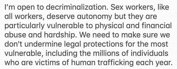 Follow up with a statement from @BernieSanders's campaign: "Bernie believes that decriminalization is certainly something that should be considered. Other countries have done this and it has shown to make the lives of sex workers safer."