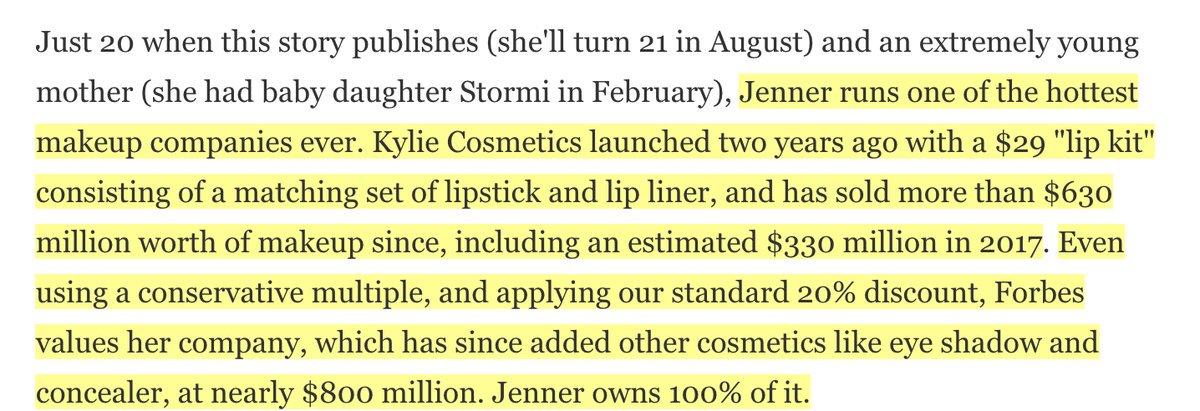 The GENIUS of Kylie Jenner: 21 years old. Launched Kyle Cosmetics 2 years ago. Kyle Cosmetics is valued at $800 million. Jenner owns 100% of her company. Now, she's set to be the youngest-ever self-made BILLIONAIRE. Incredible.