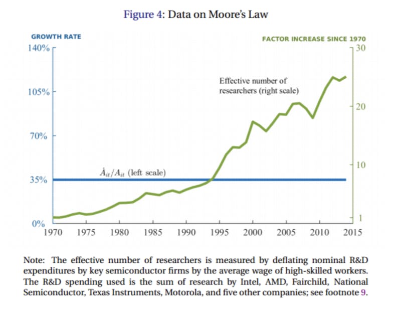 8. Moore's Law The cost to finance computer chip research has increased by a factor of 25 since 1970. The exponential growth rate of Moore's Law has been paralleled by a steep rise in the number of researchers required to sustain Moore's Law.pic.twitter.com/yx9uFKBKIG