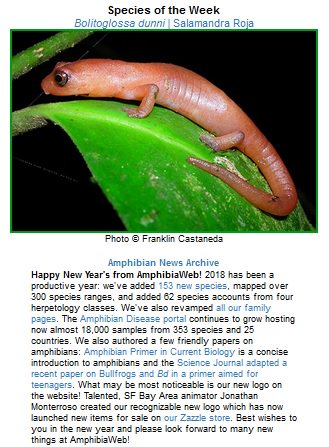 @AmphibiaWeb! We've: -Added 153 new species -Mapped over 300 species ranges -Grown the Amphibians Disease portal w/ almost 18,000 samples from 353 species and 25 countries Just to name a few! Check out these & more here: https://amphibiaweb.org/ pic.twitter.com/C2n7vB0Xrd