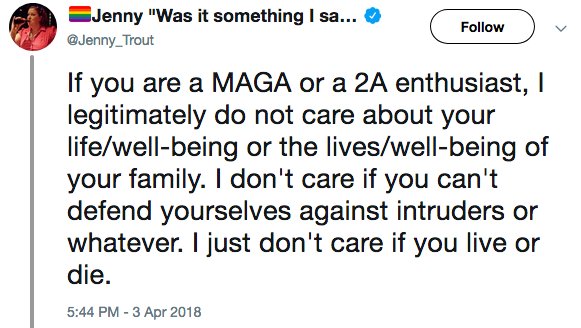 How can we have a meaningful discussion with someone who says we don't care about the murder of innocent people? You give yourself permission to hate an entire group of people. Bigotry. Murder is down by half. Gun crime is down by 70%. Source: FBI. https://twitter.com/jodirwillis/status/975768095938592768 …