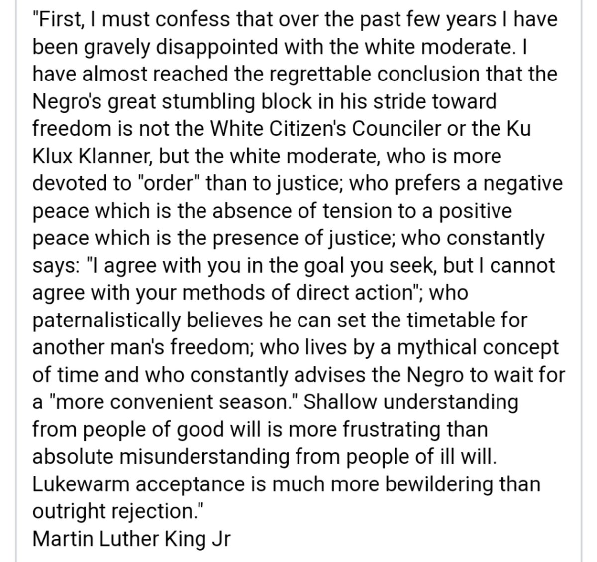 Hate the sin not the sinner. “Returning hate for hate multiplies hate, adding deeper darkness to a night already devoid of stars. Darkness cannot drive out darkness; only light can do that. Hate cannot drive out hate; only love can do that.” - Dr. King