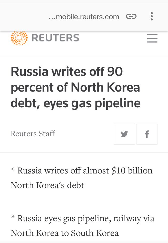 Not many people mention this, but Putin effectively owns Kim Jong Un.. : Putin wrote off $10 billion dollars worth of debt for Kim in 2014. So he can ask for favours to help keep his puppet in power. https://uk.reuters.com/article/russia-northkorea-debt/russia-writes-off-90-percent-of-north-korea-debt-eyes-gas-pipeline-idUKL6N0NB04L20140419 …pic.twitter.com/EqzooI9jQq