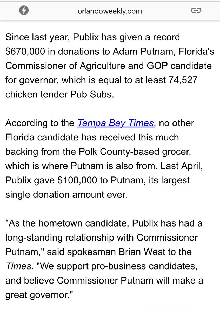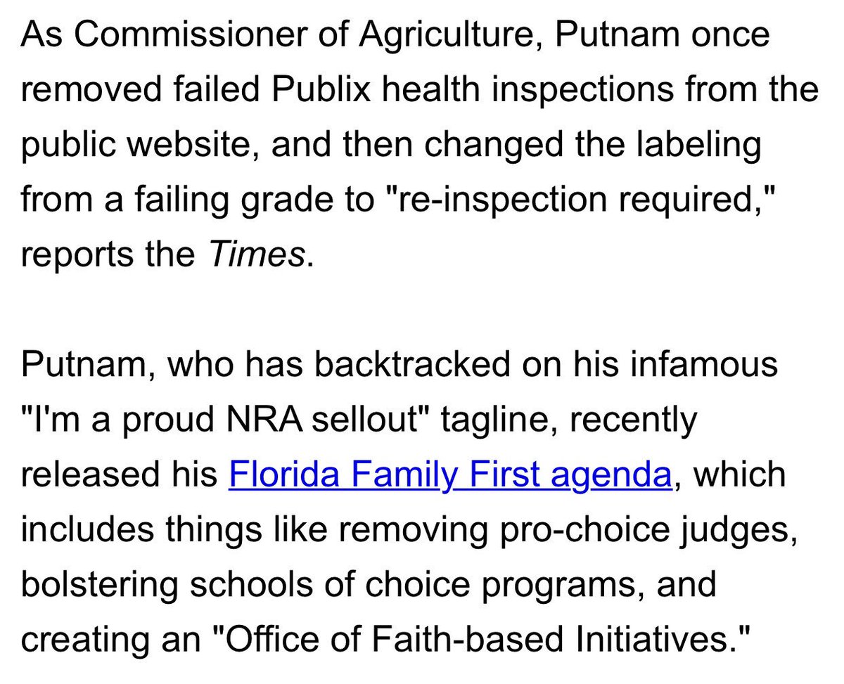 #BoycottPublix. Publix has given#NRASellout Gubernatorial Candidate,@adamputnam, Florida’s Commissioner of Agriculture $670,000. “Putnam once removed failed Publix Health Inspections from the public website...then changed the...failing grade to ‘re-inspection req.’”pic.twitter.com/RbdTzTLO8K