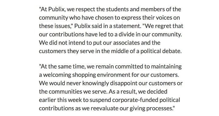 $800k in forced political contributions to an A+ NRA candidate sounds pretty deadly corrupt to me. I’m with the kids. No word on whether the Publix ‘contributors’ will receive their $ back-or whether they’ve requested it.
