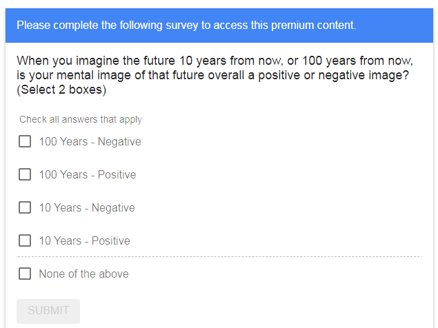 @robinhanson's survey results of his followers to a weighted US pop. sample from@Google Survey which was far more negative about the long term future. Negative Outlook Robin sample vs. representative US sample- 10 Years: 35% vs 36% 100 Years: 25% vs 39%pic.twitter.com/PTC4lja1Dn
