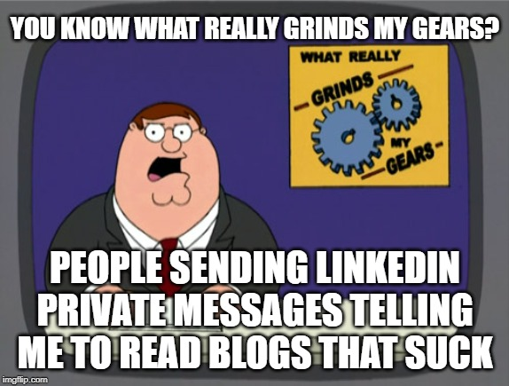 You know what really grinds my gears? People sending LinkedIn Private Messages telling me to read blogs that suckpic.twitter.com/jbXMUtPzSx