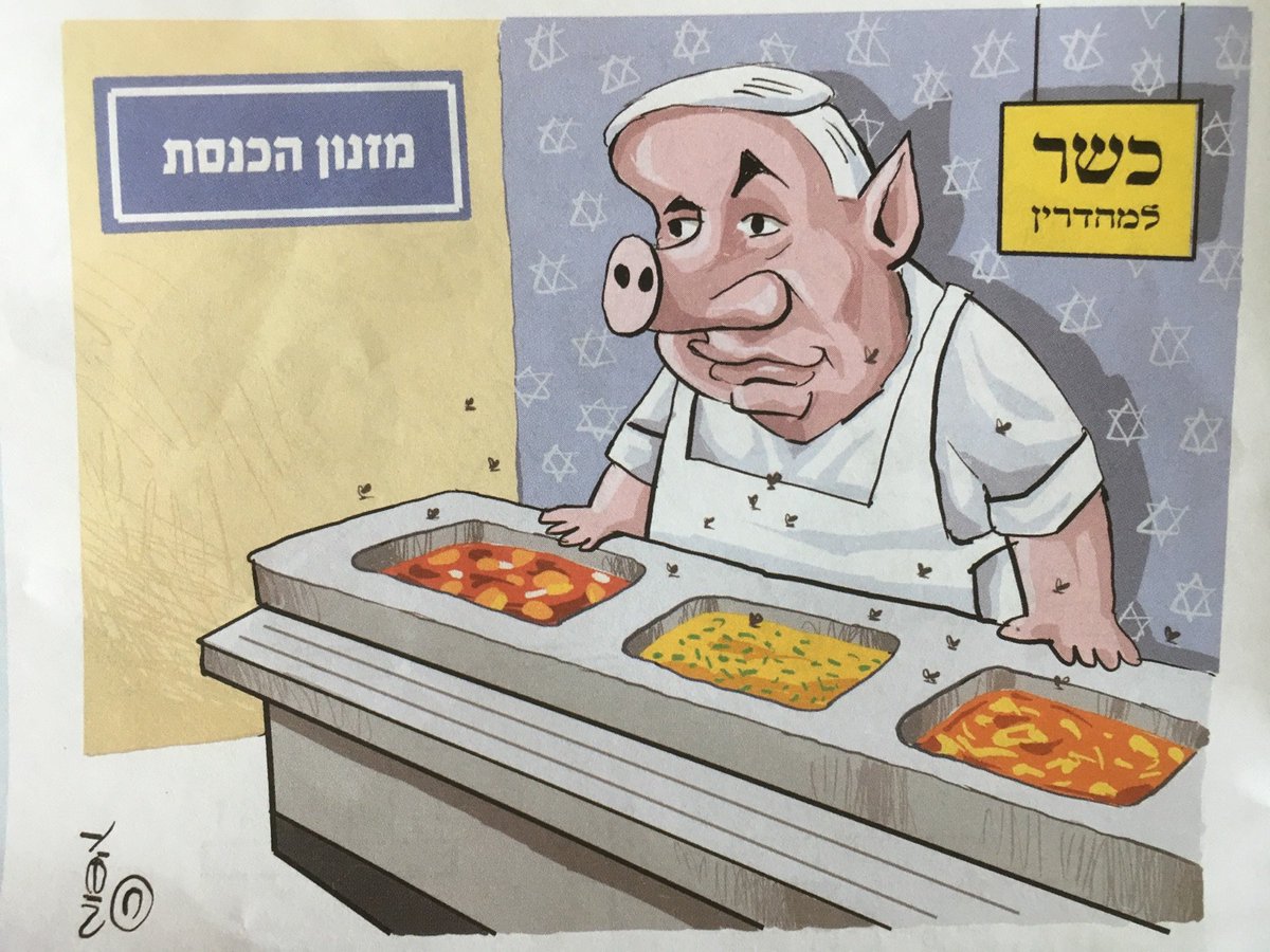 Others drew Netanyahu & Jpost serving pork: 1) Netanyahu serving at the Knesset cafeteria 2) Jpost feeding pig meat to the guard dog of “democracy” 3) “This is on the house: a skewered cartoonist on a bed of sketches, in a media sauce, no sour-pusses. You’re going to love it!”pic.twitter.com/8XDgSdLpV1