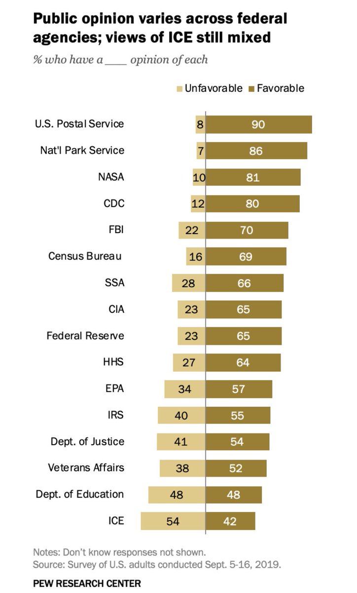 The federal agency with the highest approval rating? * The Post Office (90% favorable, 8% unfavorable). * The Census Bureau comes in a 69% favorable, 16% unfavorable. * And ICE? 42% favorable, 54% unfavorable. https://www.people-press.org/2019/10/01/public-expresses-favorable-views-of-a-number-of-federal-agencies/pp_2019-10-01_agencies_0-01/ …pic.twitter.com/OqwKu06jbh