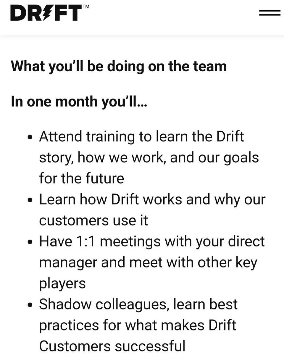 @Drift. It shows their expectations of their candidates after 30/90/180 days. It shows their investment in training staff. And it shows their company culture. Well done! https://www.drift.com/about/careers/Sr--Customer-Advocate-3296029/ …pic.twitter.com/f4Y0le22ZP