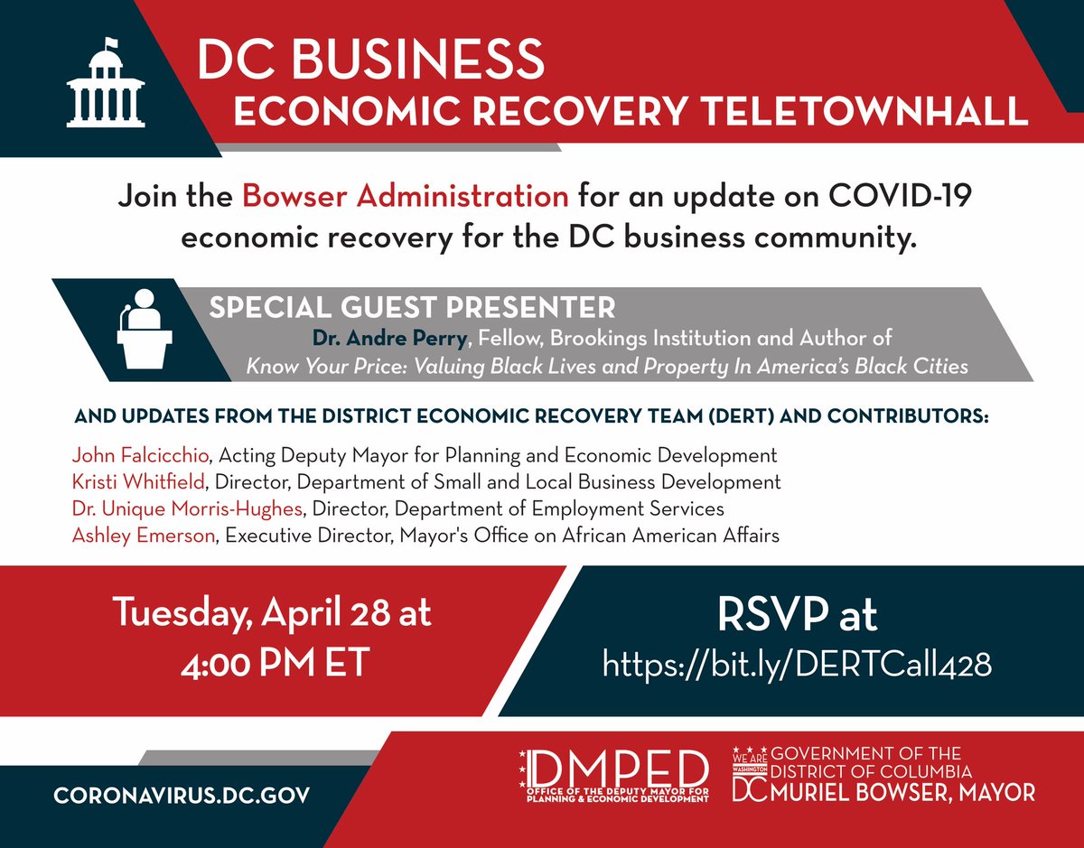Join the Bowser Administration (@DMPEDDC, DSLBD,@DOES_DC &@MOAAA_DC) and a special guest from@BrookingsInst this Tuesday (4/28) at 4 PM for updates from the District Economic Recovery Team & Contributors.
