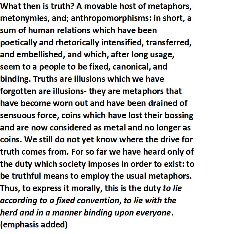 For Trump, there is no truth. Nietzsche's "#OnTruthAndLying in an Extra-Moral Sense" explains Trump. @realDonaldTrump is #MasterOfTheHerd -- he honestly believes he CREATES truth. I'm waiting for the new math. Soon, it will be 2+2=5pic.twitter.com/QF75Ws1G7p