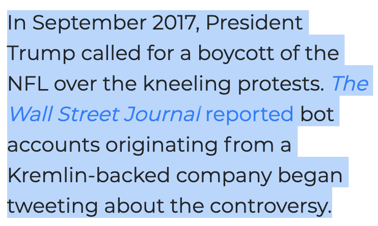 Oct. 22, 2018 Headline from that lefty Wall Street Journal: "How Russian Trolls Inflamed the NFL’s Anthem Controversy"https://twitter.com/dcexaminer/status/1149796133423767552 …