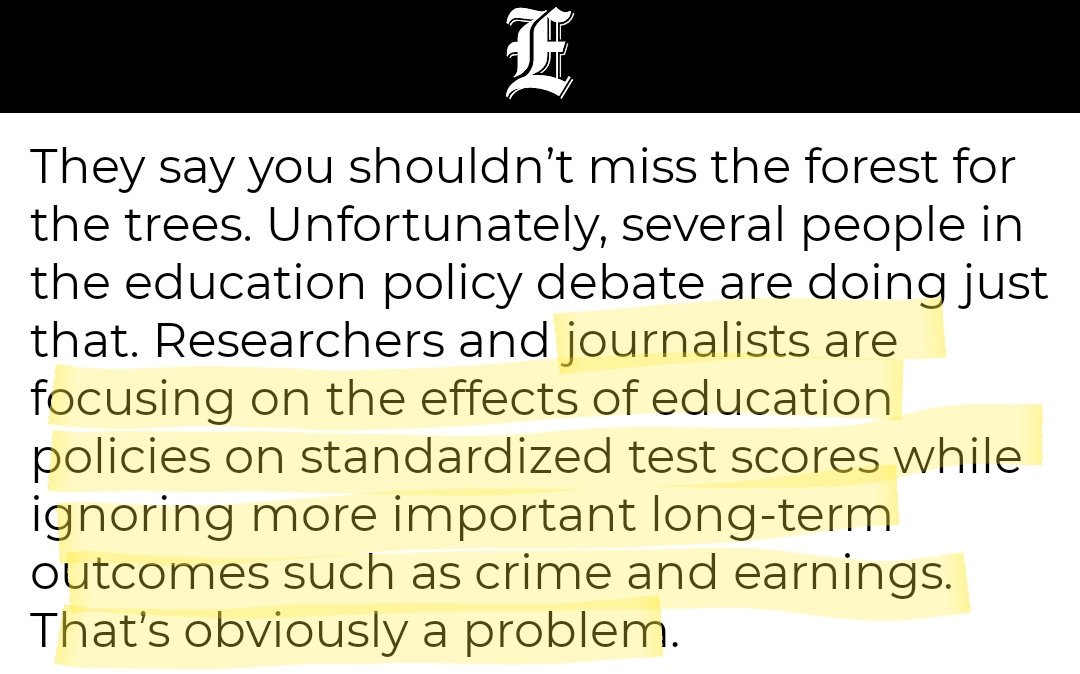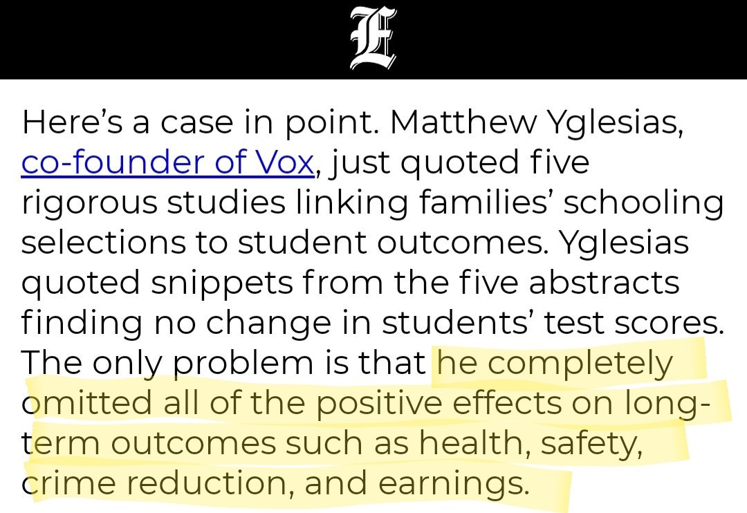 Matthew Yglesias is the latest example. He quoted snippets from 5 studies' abstracts finding no change in students’ test scores. The only problem is he *completely omitted* all of the positive effects on long-term outcomes such as health, safety, crime reduction, and earnings.pic.twitter.com/2758gIyP1V