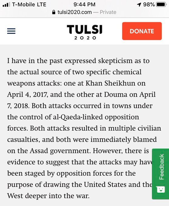 We can 'work together, raise our voices' but we don't need Tulsi Gabbard's aggressive denial of responsibility and accountability in Assad's Syria Her campaign website STILL hosts a confirmed Regime chemical weapon attack denial conspiracy theory that was thoroughly discreditedpic.twitter.com/IZdxO8FYZK