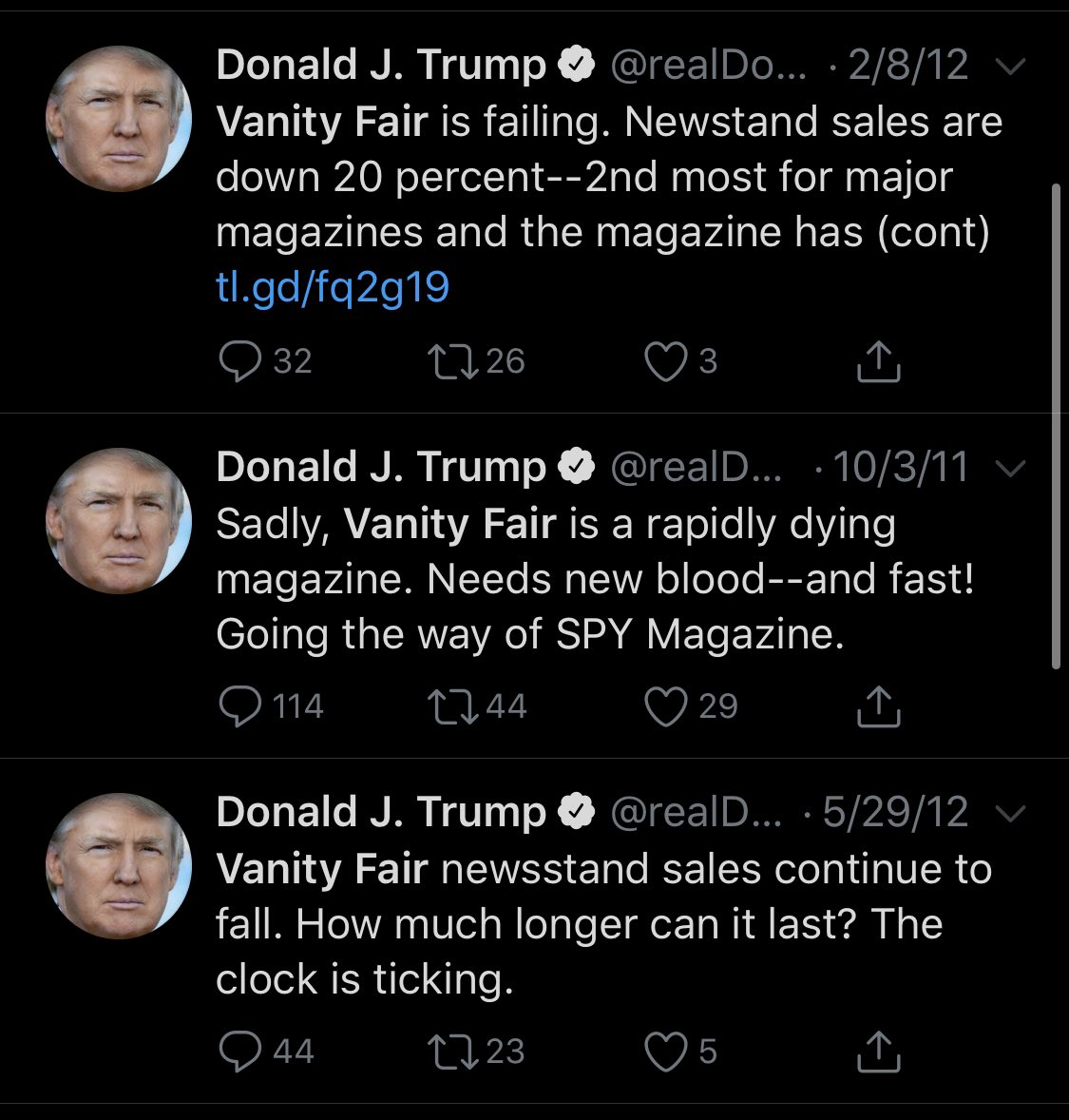 Thin-skinned Trump has been declaring Vanity Fair dead for at least a decade, but they are thriving. He can dish it out, but can't take criticism. He's a snowflake.pic.twitter.com/K1BuA3tMGg
