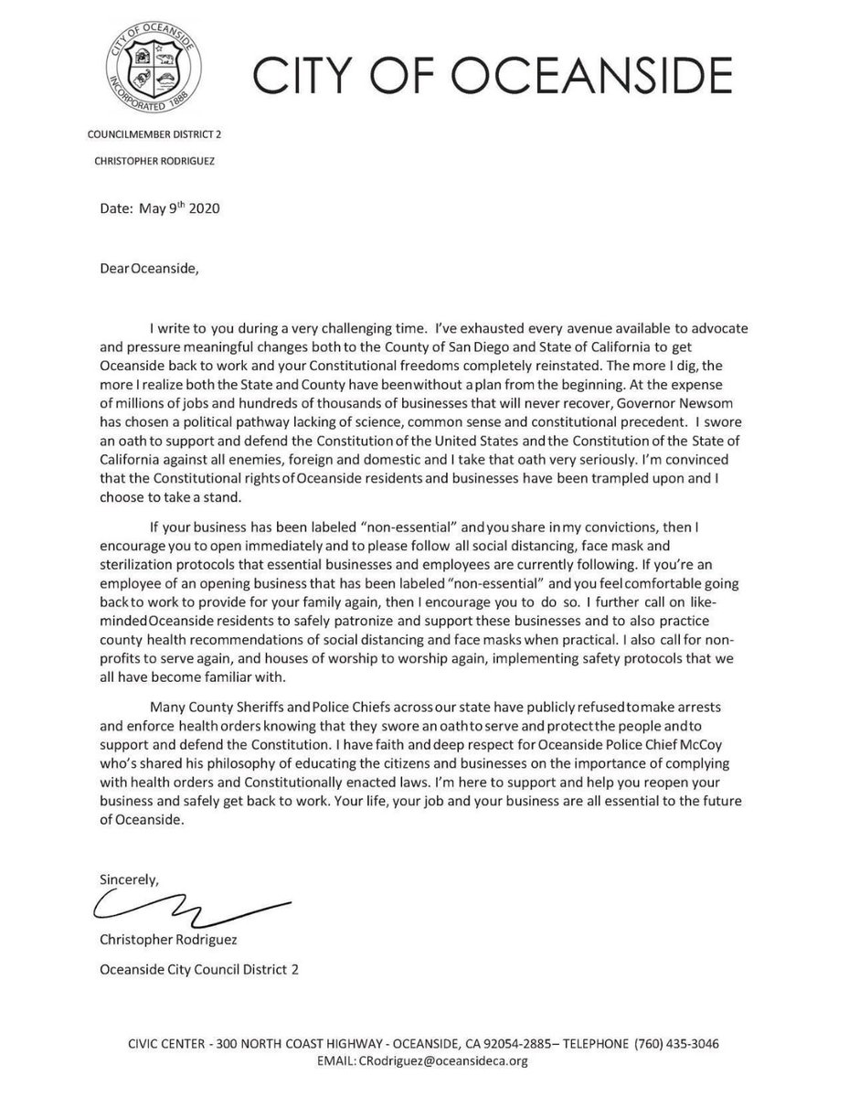 California cities are starting to revolt. Oceanside, a home of the Marines in California, just issued a letter today defying tyrant Newsom orders.pic.twitter.com/1D2U7GIPwF