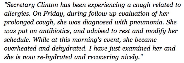 If you believe Clinton's campaign that she has pneumonia, I hv some beach front property in the Everglades you might like 2 buy