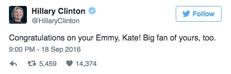 Hillary Clinton congratulates Kate McKinnon on her #Emmys win http://washex.am/2cLlFa2 pic.twitter.com/iUpZLKoYHJ
