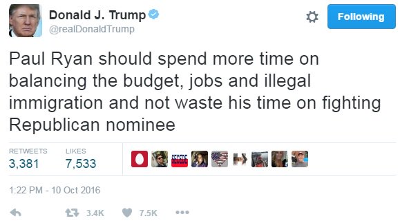 Trump....leave Paul Ryan alone NOW! Talk about the issues and failures, document leaks of Hillary supporters