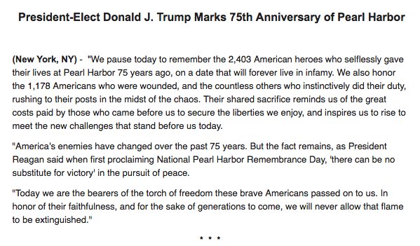 Trump on #PearlHarborRemembranceDay: "'There can be no substitute for victory' in the pursuit of peace" http://washex.am/2h6HlRg  #PearlHarborpic.twitter.com/peF1WybPUG