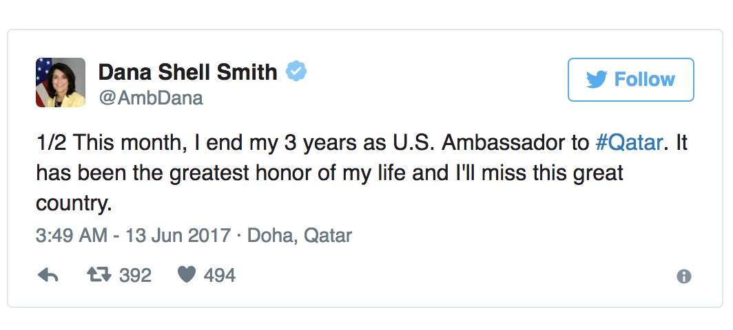 @dcexaminer: US ambassador to Qatar leaving her post as diplomatic crisis swirls http://washex.am/2sxAEjg pic.twitter.com/w3kk024oMk”