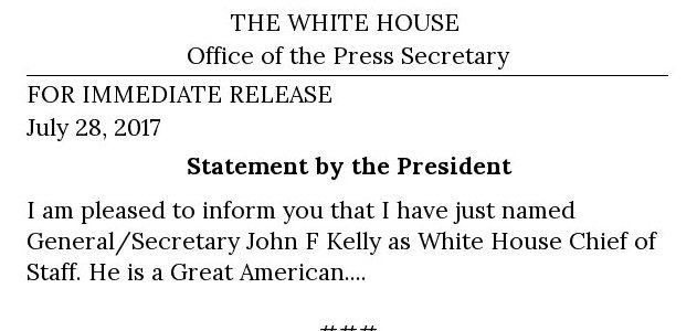 White House officially announces John Kelly as Trump's new chief of staff http://washex.am/2tKYmWT pic.twitter.com/a7RIzZN4wl