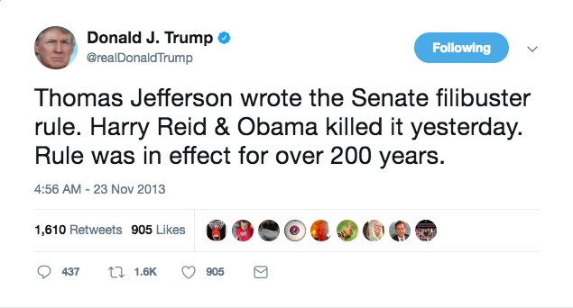 Flashback: Trump ripped Obama and Harry Reid for going "nuclear" in 2013 http://washex.am/2uaMSuV pic.twitter.com/ffk5ymZ2Q3