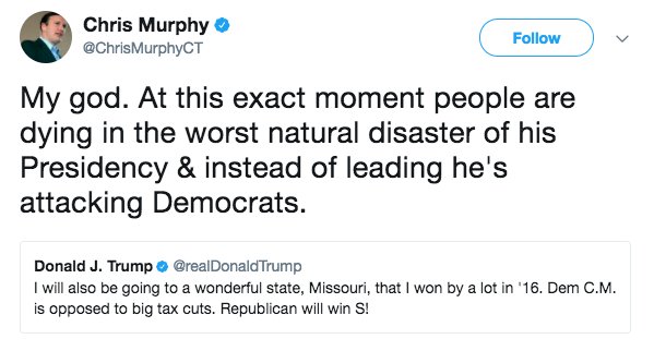 POTUS has tweeted over 25 times in the past two days about the hurricane, the aftermath, and plans to assist--but you focused on one tweet.