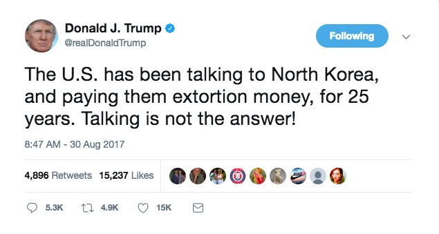 Trump tells North Korea: "Talking is not the answer" http://washex.am/2vEEYLY pic.twitter.com/WkbHhfm7Ph