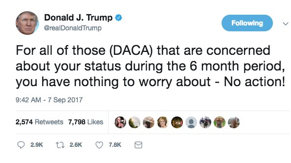JUST IN: Trump reassures Dreamers they don't have to worry about immigration status before DACA ends http://washex.am/2wKz6E6 pic.twitter.com/ftDqaZ6khp