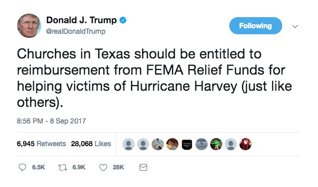 Trump: Churches should receive federal funding to recover from Harvey http://washex.am/2xm16z6 pic.twitter.com/DgNObpKQVK