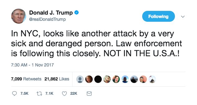 Trump: New York City terror attack committed by "very sick and deranged person" http://washex.am/2z4JYvV pic.twitter.com/5G84T3ULL4